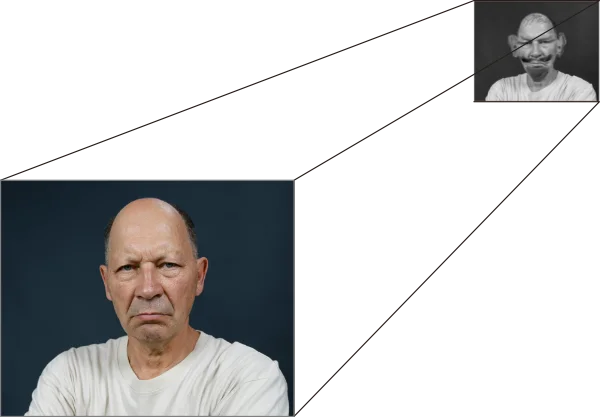 2. Vzemi to podobo (če je film ga ustavi in glej sliko). Spremeni jo v črno-belo in jo odmakni daleč od sebe, da je njena velikost le osmina prvotne. Nadeni tej podobi smešno masko ali nariši smešne poteze. Lahko jo spremeniš v najbolj smešno podobo iz tvojega življenja.